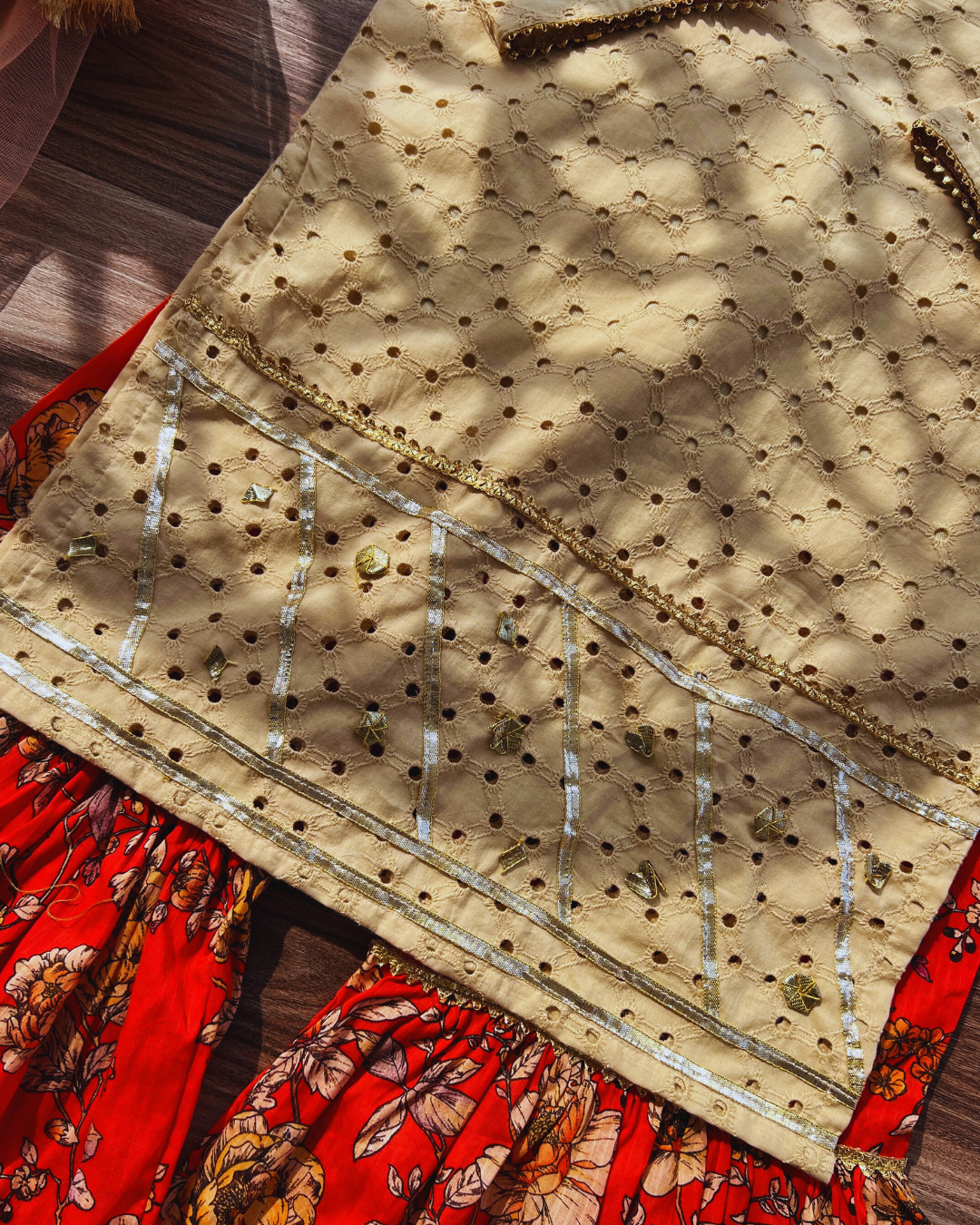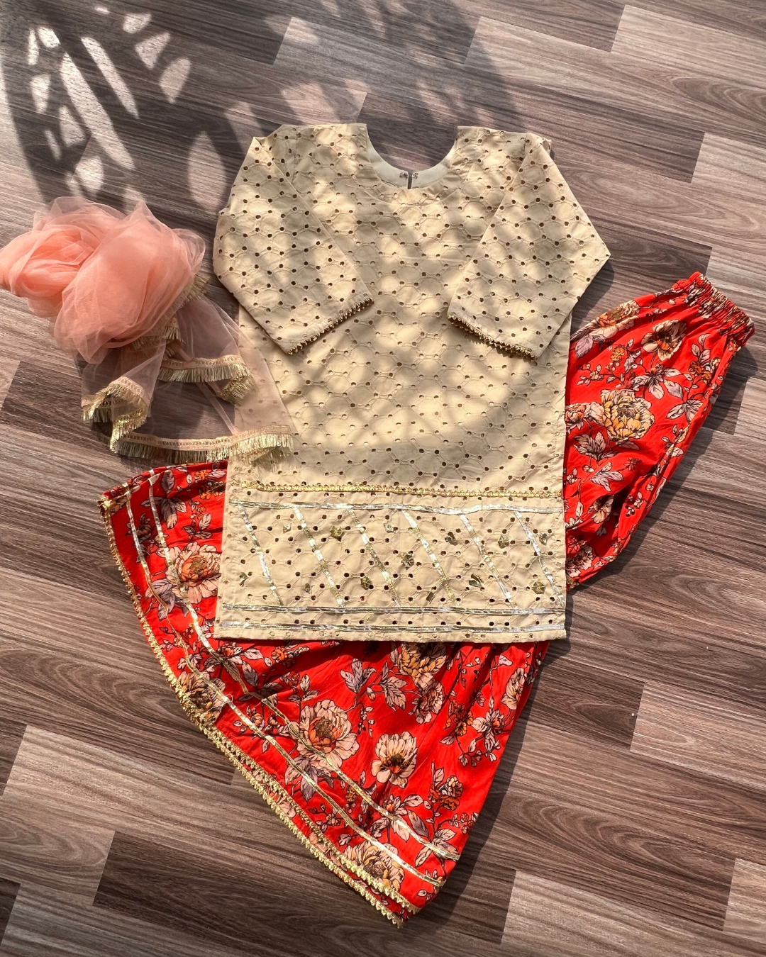 - Includes:Â Kids chickenkari short shirt with inner Flower Print gharar and dupatta