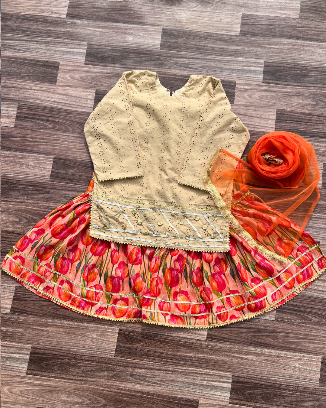 - Includes:Â Kids chickenkari short shirt with inner Flower Print gharar and dupatta