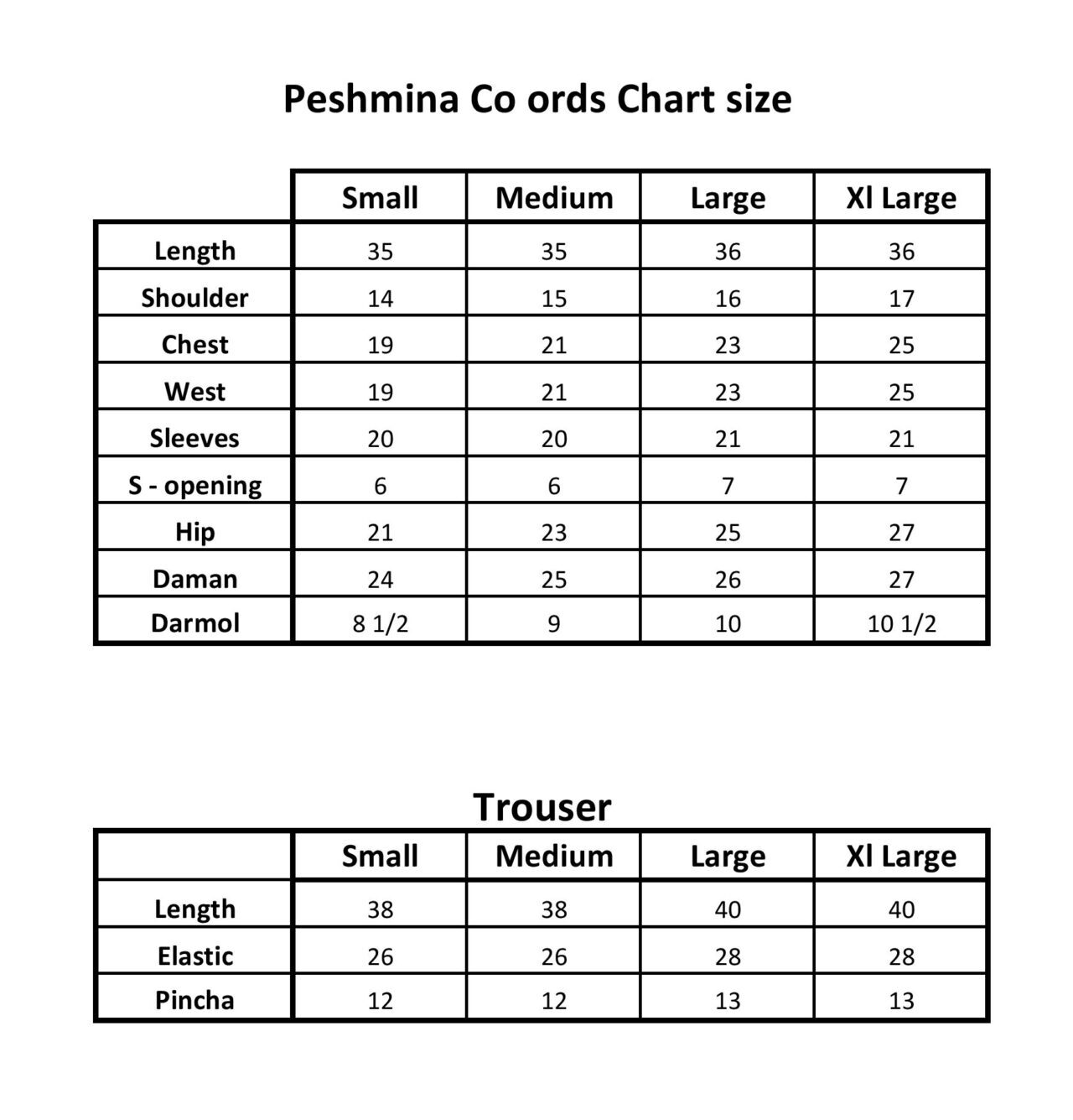 - Size : Chart Attached
