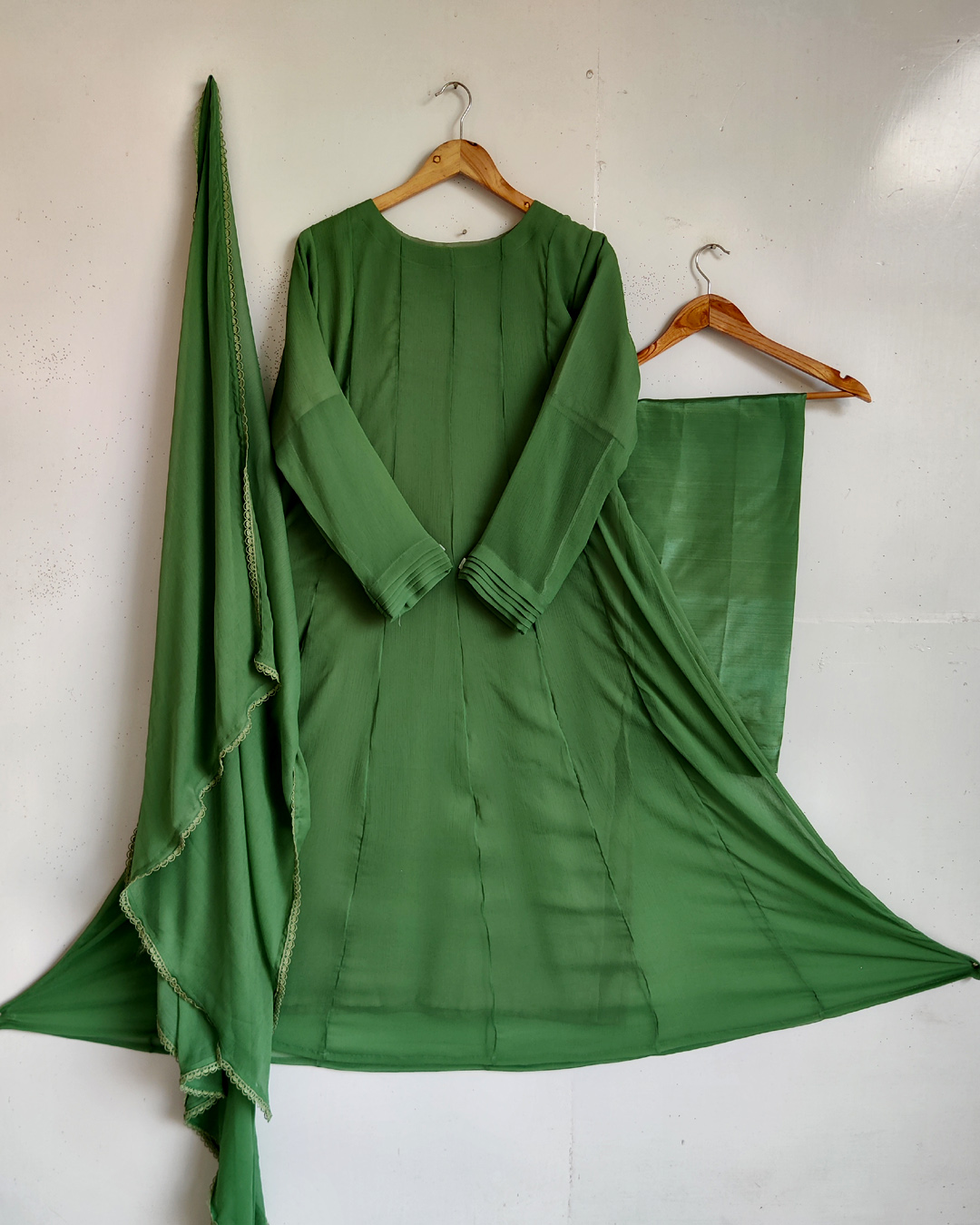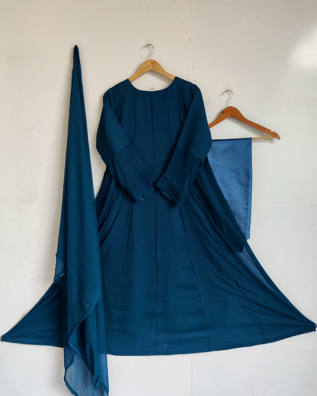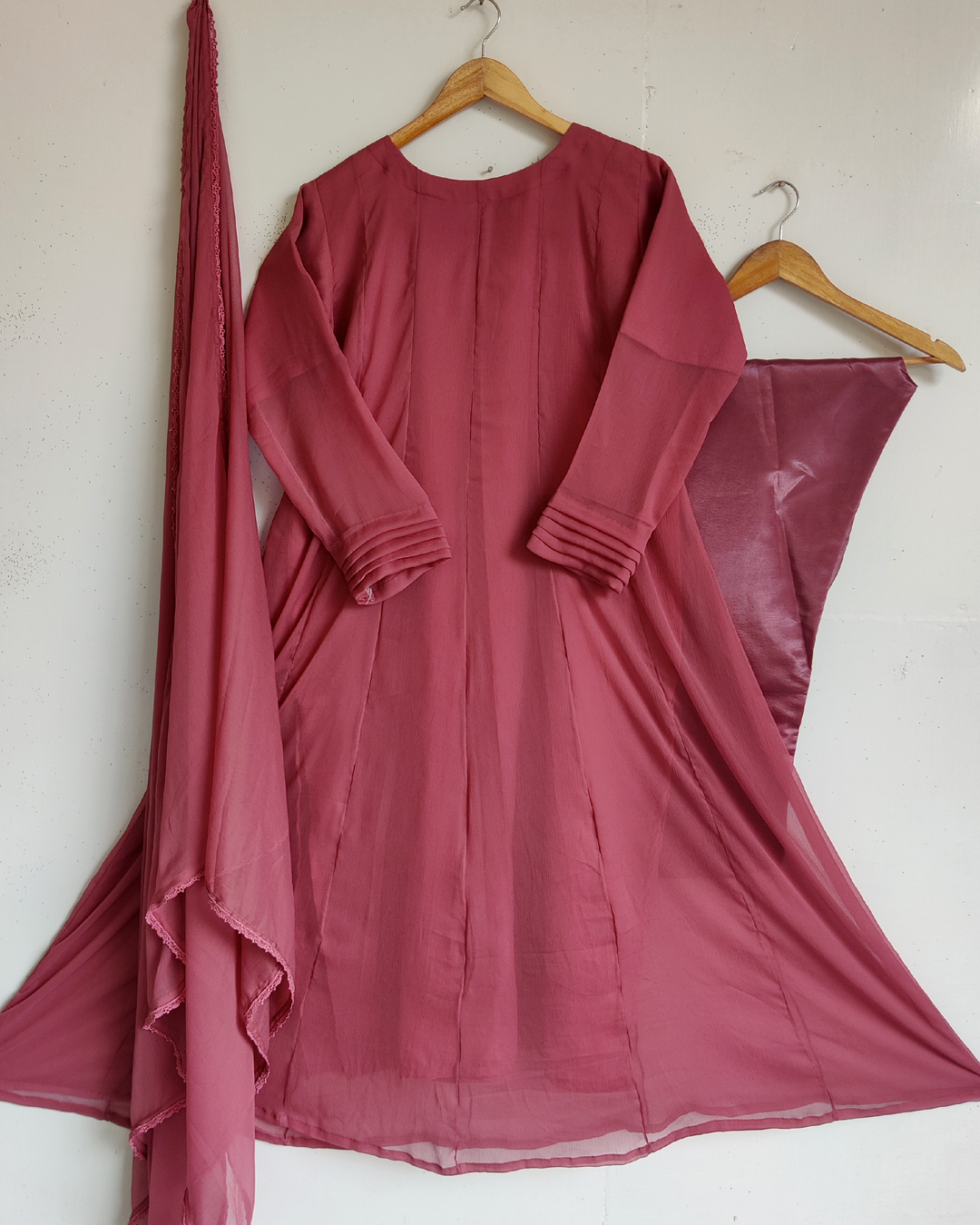 - Includes:Pure chiffon kaliyon wali maxi 52 length with chiffon duppta and trouser